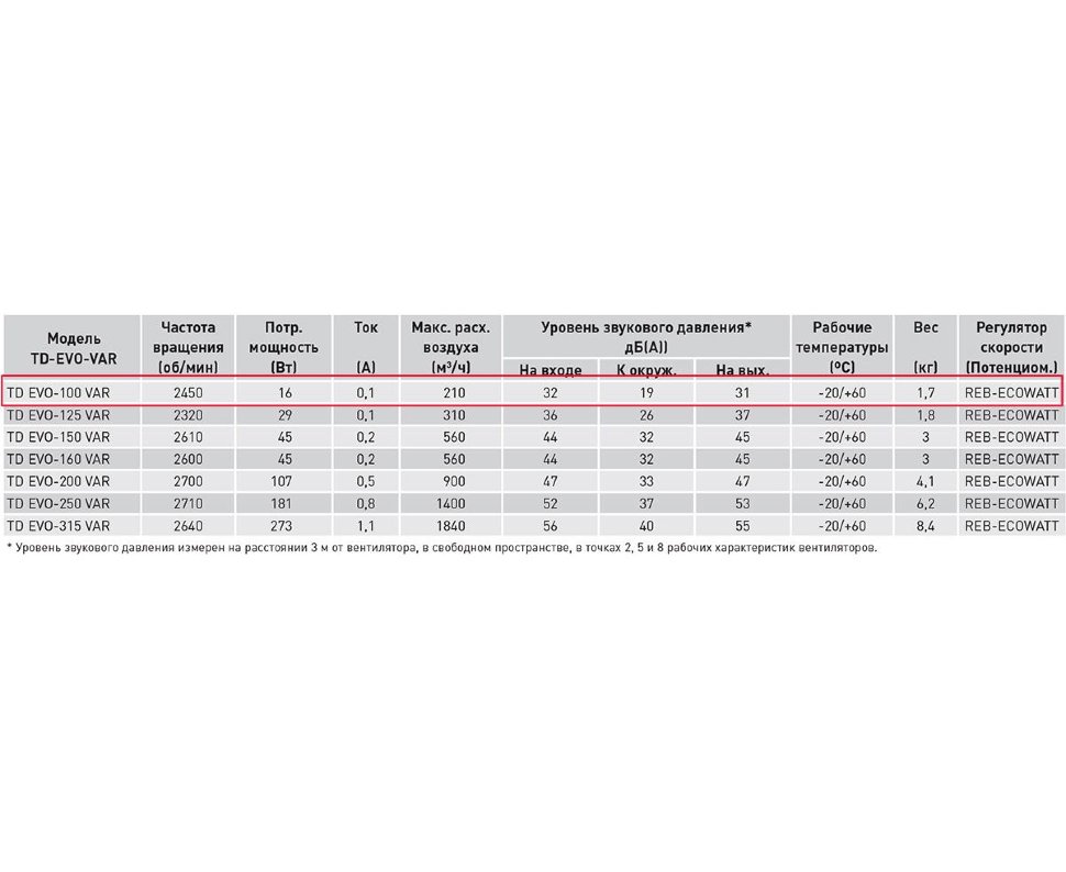 Максимальные рабочие характеристики моделей TD-EVO-VAR соответствуют кривой “HS” на графиках рабочих характеристик вентиляторов TD-EVO.