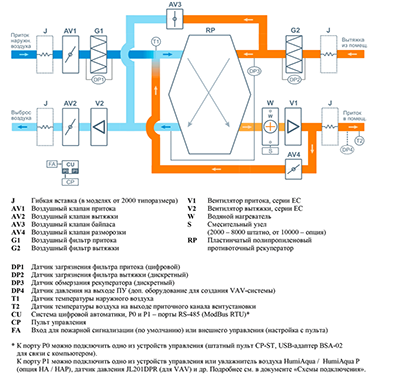 • Управление увлажнителем воздуха с пульта вентустановки.
